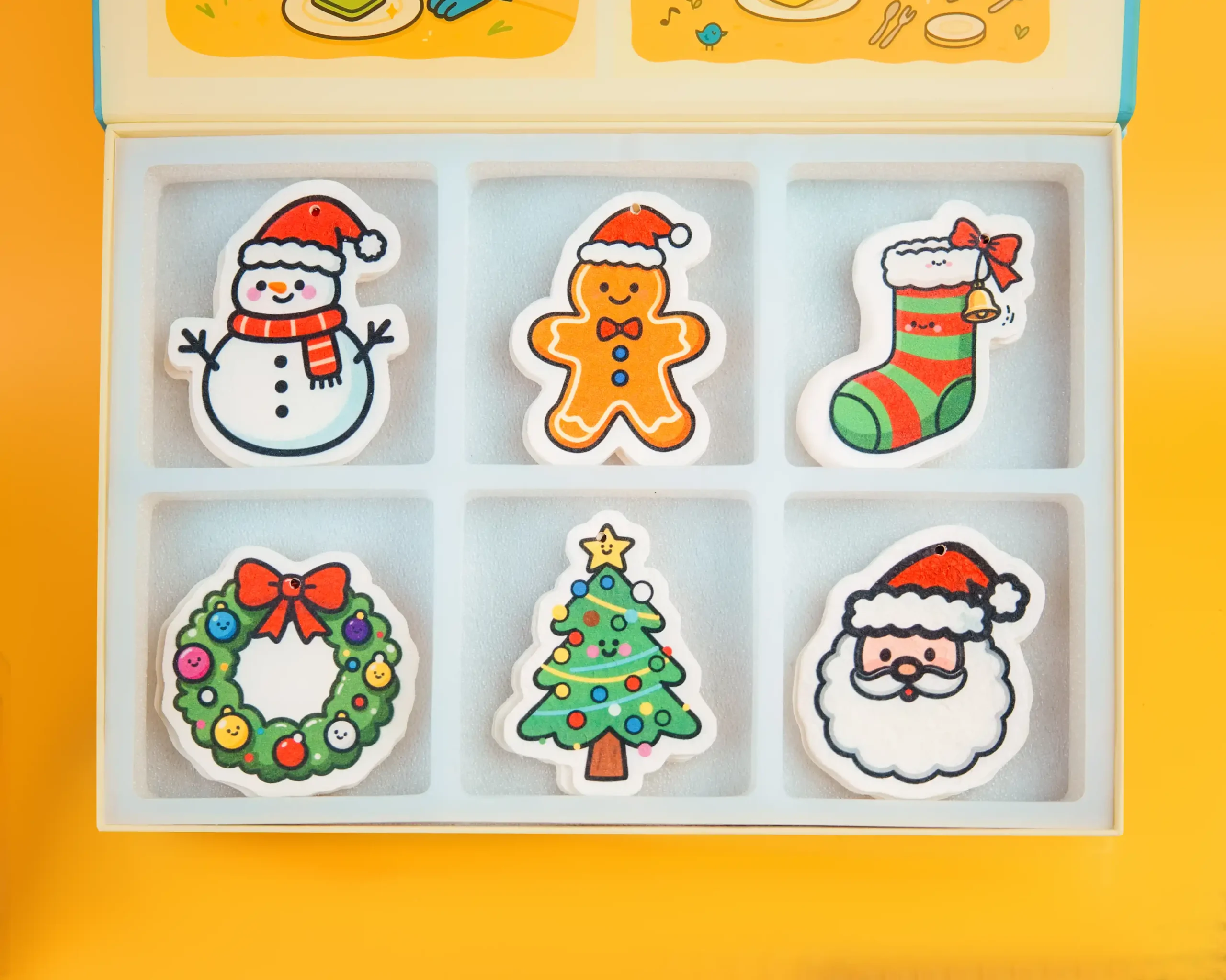 Wreath, gingerbread, tree, stocking, snowman and Santa—our Christmas Friends Sponge Gift Box